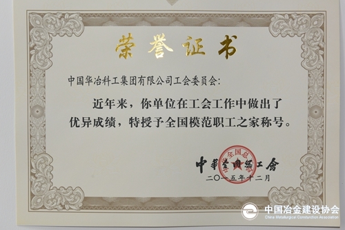 近日,中华全国总工会下发了《关于表彰全国模范职工之家、全国模范职工小家、全国优秀工会工作者的决定》(2015年38号),中国华冶科工集团有限公司工会荣获“全国模范职工之家”,中国华冶安徽分公司工会获得“全国模范职工小家”光荣称号。这是中国华冶工会首次获此殊荣。这一荣誉的取得反映了公司党政领导对工会工作的重视和对广大职工的关怀,标志着公司民主管理、科学管理水平不断提高,公司发展理念、创新能力不断提升,职工的凝聚力和向心力不断增强,紧紧依靠职工办企业的举措得到落实,职工的合法权益得到切实维护,工会成为深受广大职工拥护和信赖的温暖集体。