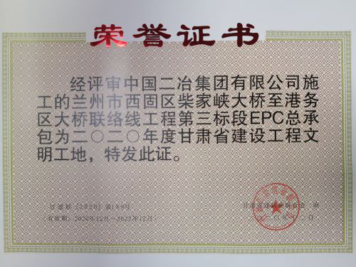 2月3日,在甘肃省建筑业联合会公布的2020年度甘肃省建设工程文明工地评选结果中获悉,中国二冶兰州市柴家峡黄河大桥工程荣获“2020年度甘肃省级建设工程文明工地”荣誉称号。