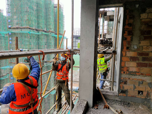 人员和施工物资是复工的保障。人从哪里来?项目部早安排早部署,集中组织当地劳务队伍进场,做好疫情不严重地区劳务队伍返岗。物资招标提前启动,并多方协调联系施工用料。复工当天,项目部迅速组织施工现场安全检查,对现场的临边洞口防护、外脚手架、安全网以及三级用电设施、电线、电缆、电箱,12台塔吊、21台施工电梯等涉及安全生产的设施设备进行了统一检查,对现场拆料进行了细致盘点。同时,项目部倒排工期,重新制定了网络工期计划,部署了复工后项目建设。随后,项目四个标段的作业人员迅速投入到工程建设中,争分夺秒向全面履约目标奋力冲刺。从复工到目前为止,四个标段的劳务队伍迅速集结,近200名建设者坚守现场,展开二次结构施工和装修装饰作业。3月1日,在22#楼具备外脚手架拆除条件后,迅速组织20名特种作业人员对22#楼进行拆除施工。在拆除前,项目部对塔司、信号工、架子工进行了安全培训。拆除中,由项目安全人员进行旁站,在主楼四周设置了安全隔离区,在确保安全的前提下,如期完成了外脚手架的拆除任务,这是复工后项目部完成的首栋主楼外脚手架拆除。