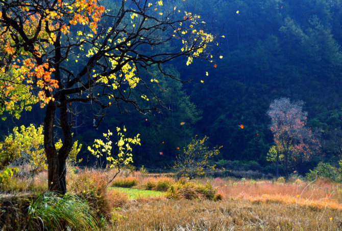 秋在古人的诗中多有萧索寂寥之意,但不同的人有不同的心境,不同的景色赋予生活不同的色彩,正所谓“自古逢秋悲寂寥,我言秋日胜春朝”,如果你有一双发现美的眼睛和感受美的心灵,那么季节的轮转将只是一幅岁月之笔书写的长篇画卷,或繁花艳艳,或草木葱葱,或黄叶灿灿,或白雪融融,尽管画风不同,却都美得动人,美得厚重。所以,不要纠结于叶与树的别离,那只是在酝酿下一次的美好相遇;不要惋惜于百花娇艳的逝去,那只是在渲染来日丰收的欢喜。秋高气爽的日子里,不妨漫步树叶零落的小径,寻景入诗画,读景入心间,感受叶入根部的反哺感恩,感受花落果丰的潇洒坦荡,那么即便体悟了“无边落木萧萧下”之中澎湃的愁绪,依然能从漫天的金黄中感受秋的绚烂壮观。
