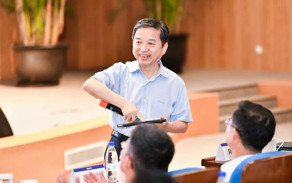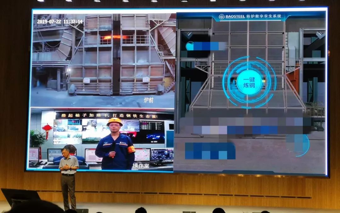 7月22日上午11:30,在宝钢股份中央研究院4号厅举行的中国宝武党委理论学习中心组(扩大)学习暨智慧制造宝钢股份宝山基地现场会上,当宝钢股份总经理、党委副书记侯安贵介绍说,宝钢股份宝山基地炼钢厂最近研发成功了利用5G技术实现远程一键炼钢时,会场大显示屏上的画面切换到炼钢现场。