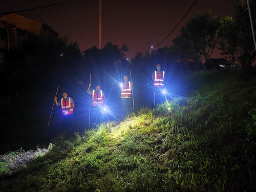 “我们站成一排往前进,电筒、竹篙拿好,大家走密点,看细点。”晚9时20分,章冠楚带着4名队员从琴断口街防汛分指挥部第一值守点出发,开始新一轮巡堤。他们在40度左右的背水坡上呈一字排开,一人在堤肩,两人在半坡,一人在堤脚,借助手中的强光手电,向前搜寻排查。