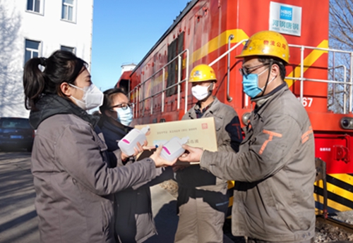 2月17日,唐钢物流分公司工会女工委正在组织为一线运输机组职工赠送消毒用品。