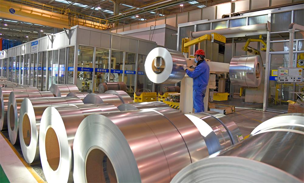 11月26日,中国宝武太钢集团精密带钢公司职工在进行高端精带产品生产。