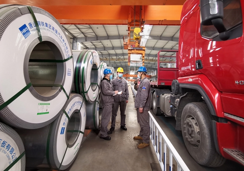 3月12日,河钢唐钢物流分公司青安岗队员正在高强汽车板库区产品发货现场检查青工安全标准化作业程序。