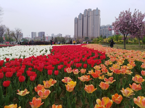 从这副立轴再往纵深眺望,中山街深灰的屋顶背后就是咸阳湖,那里一定早已是姹紫嫣红了。近年来,咸阳为了改善人居环境,举全市之力对渭河两岸进行改造提升,在昔日杂草丛生的盐碱地上遍植奇花异草,硬是将绵延数里的渭河滩打造成了名闻遐迩的4A级景区,曲径通幽,处处有景,妥妥帖帖是一副百看不厌的立体卷轴。往年这个时候,哪里用得着这么小气,推门出去,三五分钟便走上河堤,上林花似锦,人在画中游。触目所及,雪白的梨花,妖娆的桃花,金黄的连翘,雍容的玉兰,深红的海棠,淡粉的早樱,娇小的紫叶李,你不让我,我不让你,把渭河两岸打扮得花团锦簇,热热闹闹。花朵是这个季节的主角,那拂堤的垂柳,乱窜的侧柏,散淡的白皮松,全都成了配角和点缀。我穿着薄薄的衣衫,徜徉在无边春色之中,看蜜蜂和蝴蝶在花朵间奔忙。要是走得冒汗了,随便在湖边找一个长椅坐下,任春风亲吻我有些僵硬的指尖,而我的眼睛只负责追逐那些冉冉升起的风筝、衔泥筑巢的燕子、在花丛间穿梭追逐的孩子。再有十天半月,那大片大片的郁金香、国色天香的牡丹就该登场了,清渭楼广场的樱花也该花枝灼灼灿若云霞了。