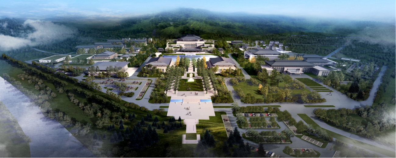 该项目由中国建筑设计大师张锦秋主持设计,秉承“山水形胜、中正仁善”设计理念,体现孟子“性本善、养正气、重民本、行仁政”的文化思想。按照“中轴端庄、两翼活泼、主从有序”的九宫格建筑布局,排布了15个建筑主体和相应景观工程,形成了以“浩然之气”石牌坊——孟子广场——孟子雕像——孟子大殿为主轴,右侧为住宿餐饮生活服务片区、左侧为行政办公党校教育工作片区。