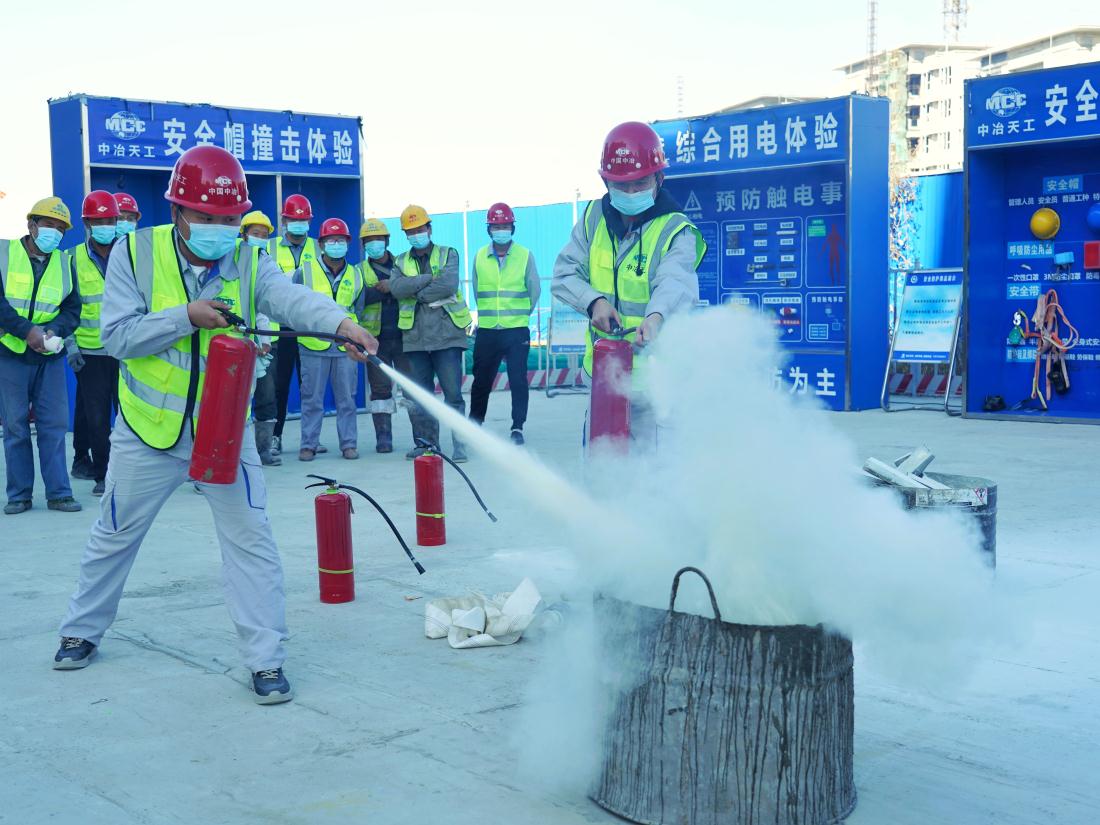 为了能够让施工人员实现“理论联系实际”,活动还安排了消防演练环节,为确保演练真实感,设置抢险救援组、警戒保卫组、通讯联络组、后勤保障组,由项目安全经理组织施工人员进行初期火灾扑救、引导人员疏散、自救逃生等应急演练,使其掌握协同作战、快速反应、科学施救、紧急疏散等各方面技能,进一步提升应对突发火灾事故的自防自救能力,为确保项目安全生产下好“先手棋”。