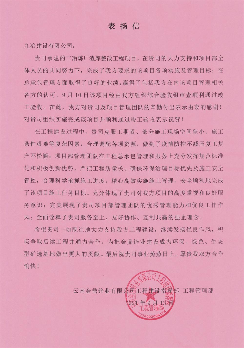 业主来信赞扬九冶云南金鼎锌业项目完美履约