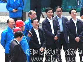 贺国强等领导在首钢京唐公司5500立方米高炉现场听取工程建设情况汇报。李宝山 摄