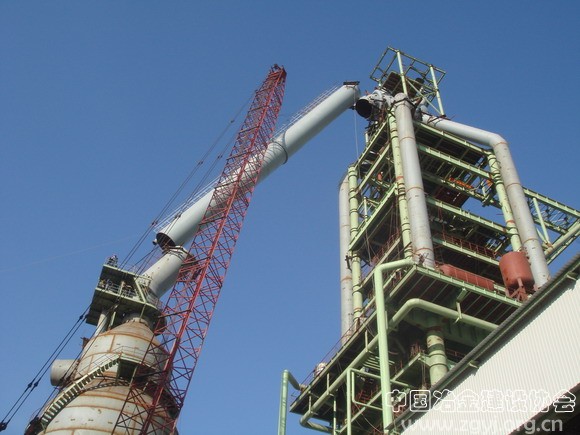 高炉下降管采用新的工艺设计,安装高度高、管径大、重量超重,在球体与四根上升管顺利对接后,下降管成为下一个吊装难点。下降管包括88°弯头及弯头内喷涂及放散管、煤气均压管,总重超过87t,超过吊车的吊装能力。下降管包括弯头部分(重33t)和长度36.7m,直径¢2.8m的直管部分(重54.68t),直管段面对弯头下部标高▽77.2m, 重力除尘上部接口标高▽46.1m, 倾角要求为58度的施工条件,将下降管直段一次顺利吊装到位难度极大,承担高炉安装的机电公司机四处会同项目部多次研究优化吊装方案,反复计算,确保了下降管顺利吊装。上午九点十八分,随着机电公司机四处起重班长王心全的一声清脆哨响,承载着2008年希望的一条长龙由地面缓缓升起,十点十八分,下降管顺利吊装就位。
