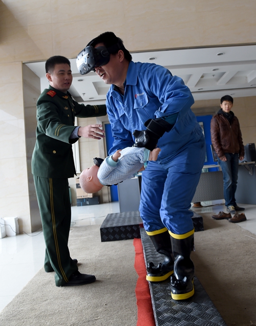 11月19日,太钢职工通过VR技术体验高层楼房着火现场救人。